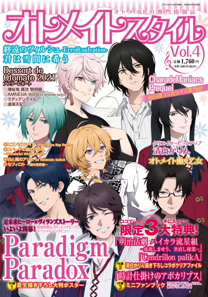 描き下ろし表紙&巻頭特集は、本誌発売直前となる5月27日(木)発売の「Paradigm Paradox」! ヒーローサイド・ヴィランズサイドあわせて全8名が集結と、オトメイトスタイル史上最大の人数で贈るインパクト抜群な表紙イラストはふろくポスターとしても収録されているので、お見逃しなく!