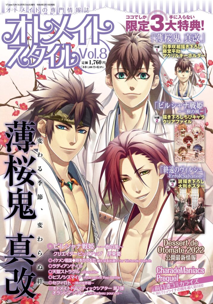 3月14日(月)発売のオトメイトスタイル Vol.8は、「薄桜鬼 真改」より藤堂平助・原田左之助・永倉新八の3名が表紙を飾ります。